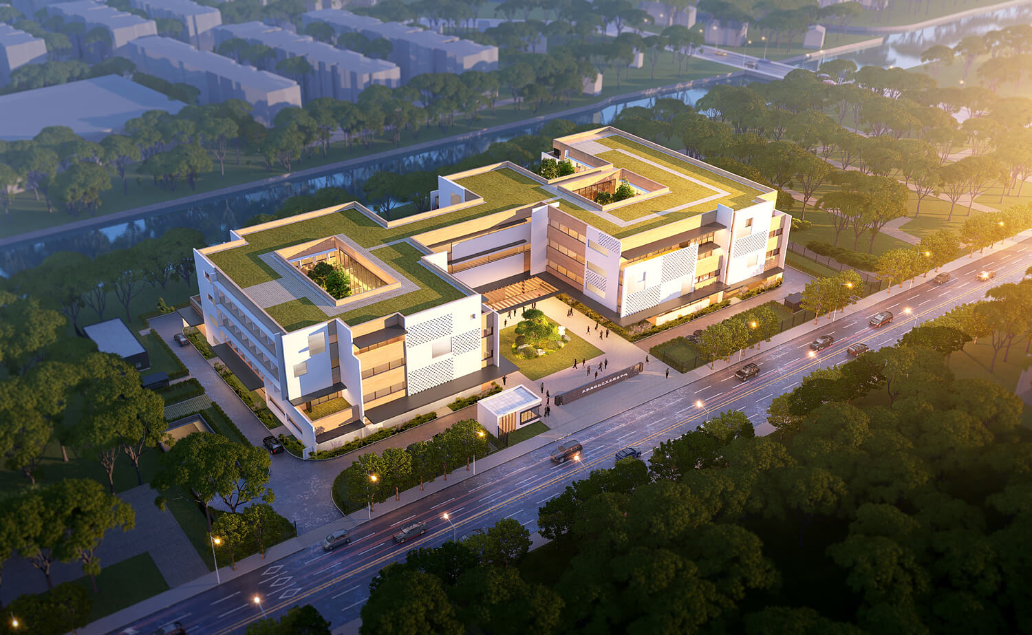 Showcase the full residential design with realistic materials, lighting, and landscaping.