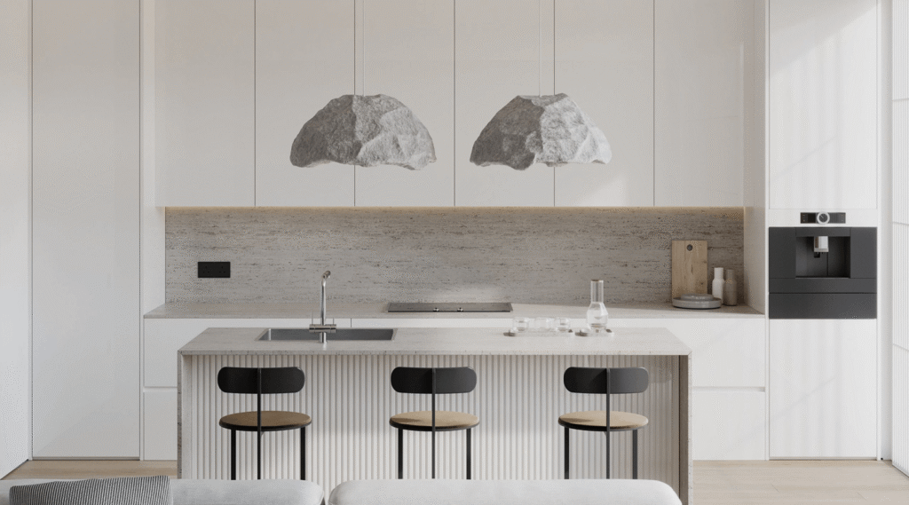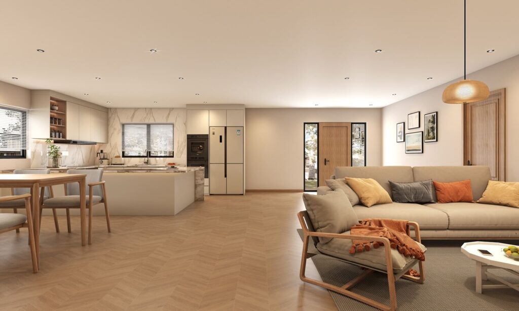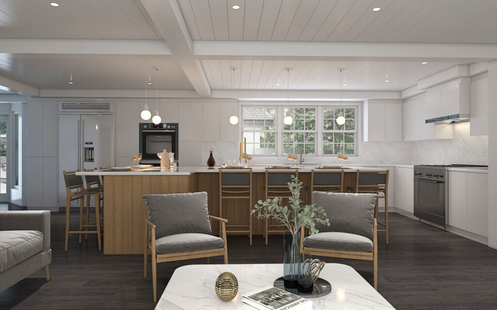 Realistic interior renderings for residential spaces, including living rooms, kitchens and bedrooms.